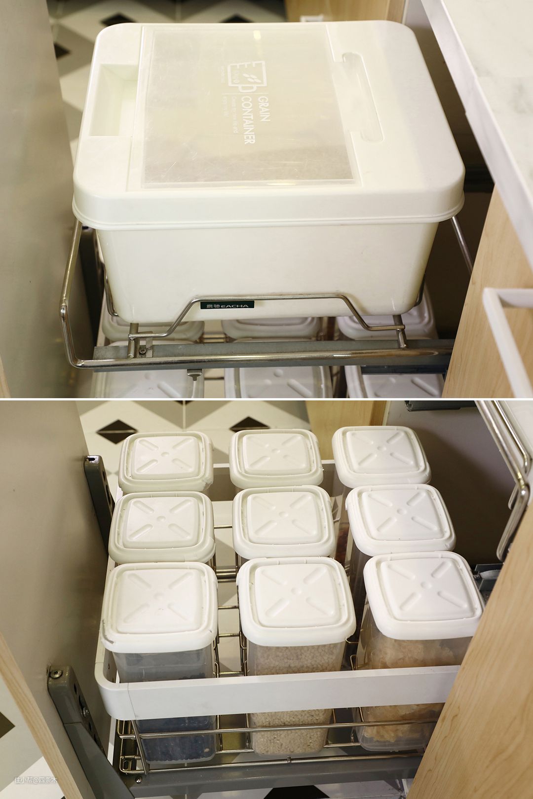下面是好几个透明的收纳罐,经常要吃的几种杂粮干货都放在罐子里储藏,更方便更卫生,还可以储藏更久。每一个罐子都被卡槽固定住,收纳更安心。