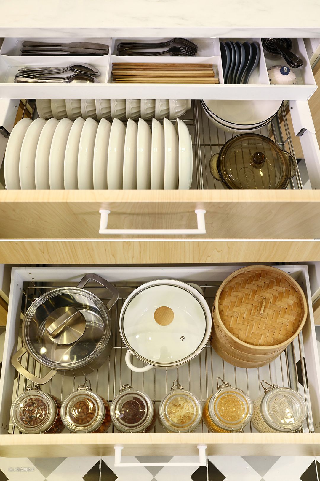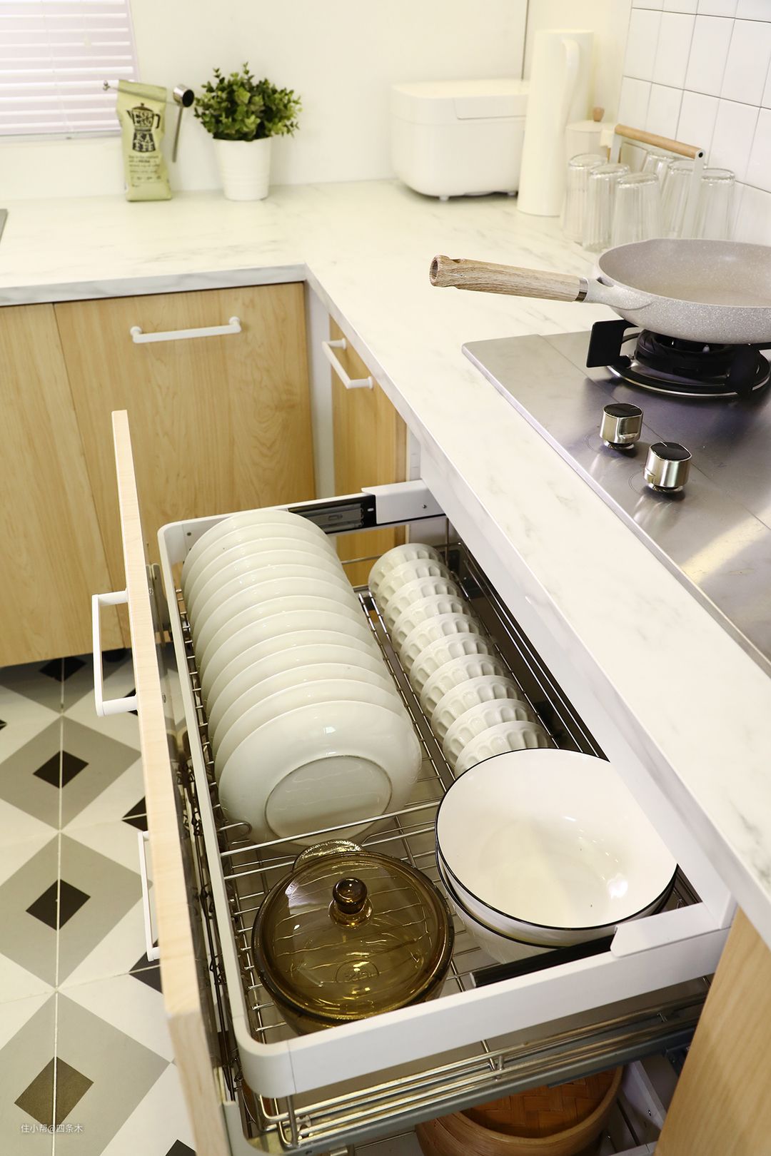 收得好各类小工具,常用的碗盘怎么会收不好?一整套碗盘轻轻松松放进去,竖放收纳节省更多收纳空间,碗盘的拿取也更加便捷,直接抽出来就可以。