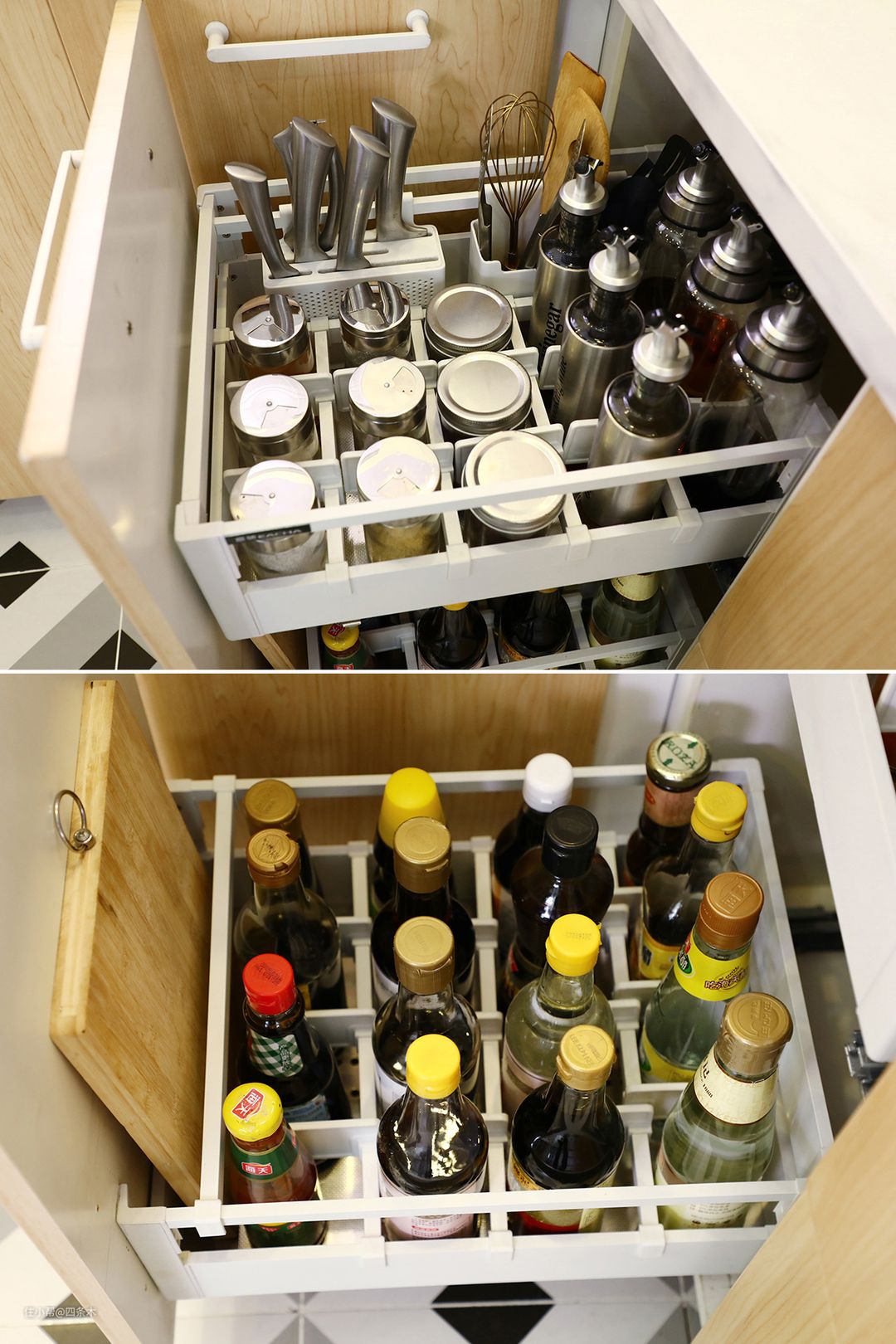 整整齐齐被固定住的调味瓶,想用哪瓶就拿哪瓶。把可以调节的分隔片和分隔条放进去,就是一个一个格子的收纳瓶瓶罐罐,每一瓶都被稳稳地固定住,不用担心拉开柜子的时候会晃动。而且侧边还有几个收纳盒,轻松取挂,可以分担放置一些长柄工具。