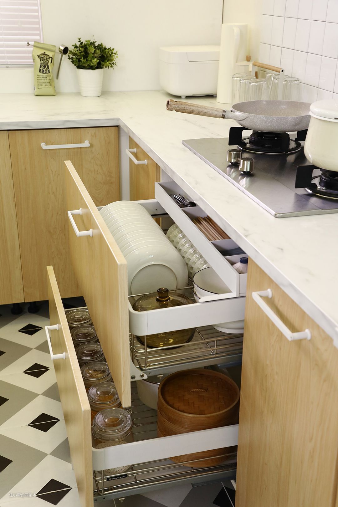 入住了多年的厨房,东西一年比一年多,厨房想不乱都难。厨房想要收纳整整齐齐,收纳工具少不了,所以家里房子装修的时候,厨房拉篮可以多装几个,这样可以增加很多收纳空间!