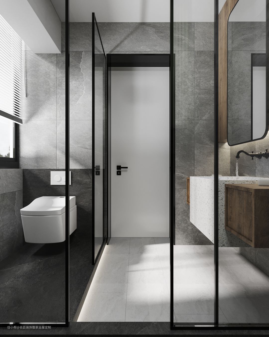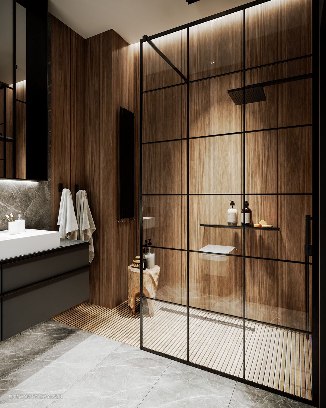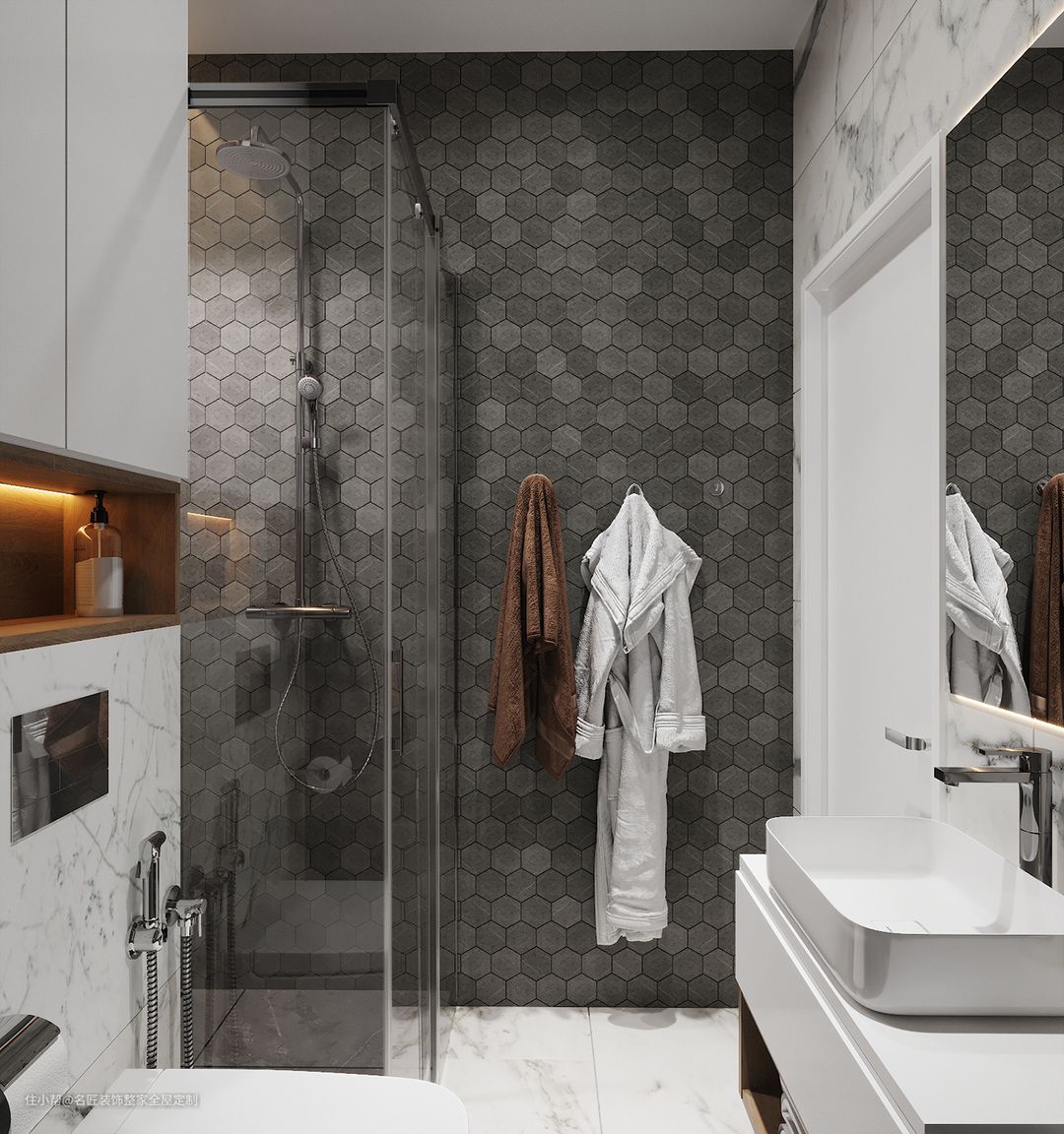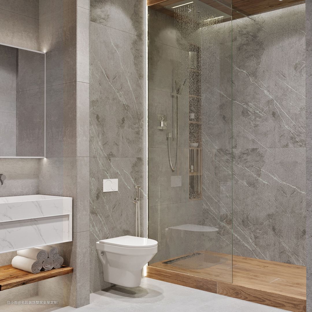 淋浴房用木色瓷砖抬高区分,呼应外部,不显疲劳