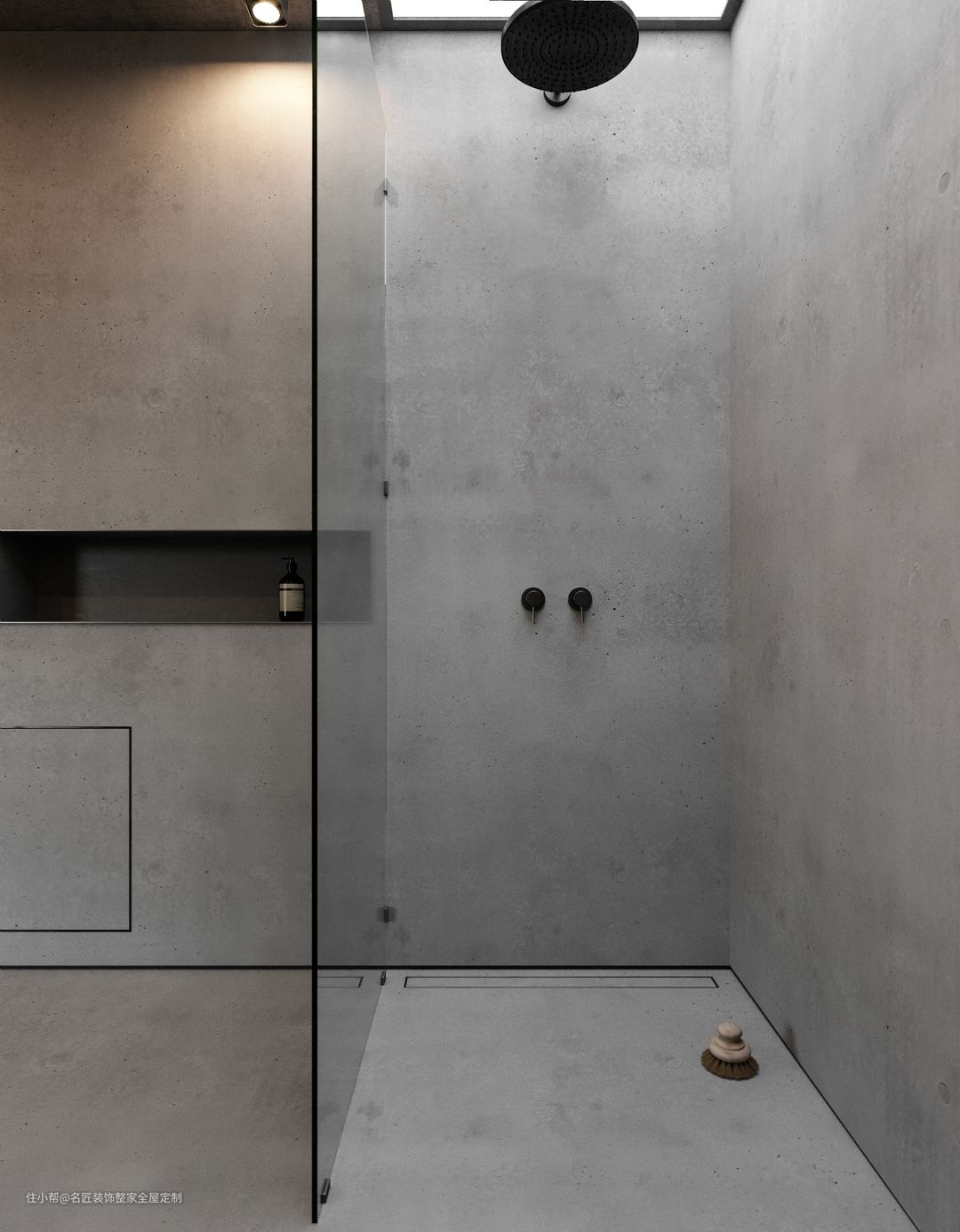 落地洗手池划分区域,边上设计单板收纳