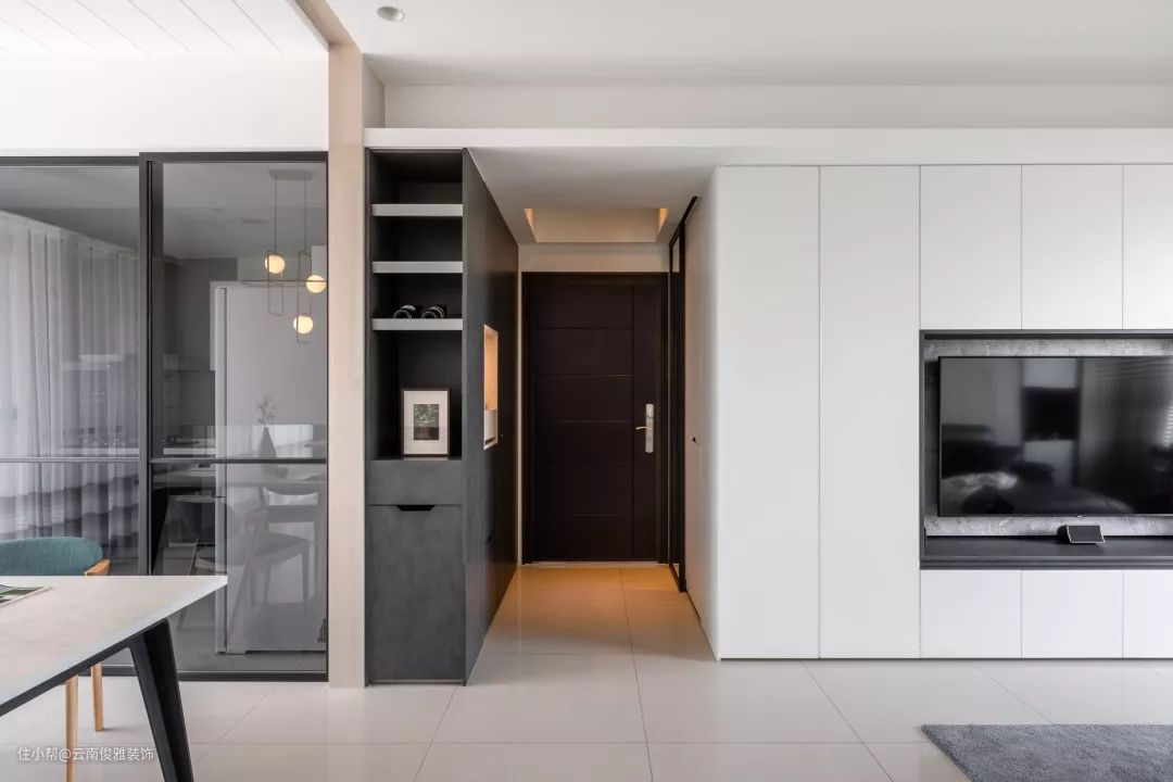 客餐厅中间的这个玄关柜体,保持水泥灰的色调,也让空间显得格外的简约自然。