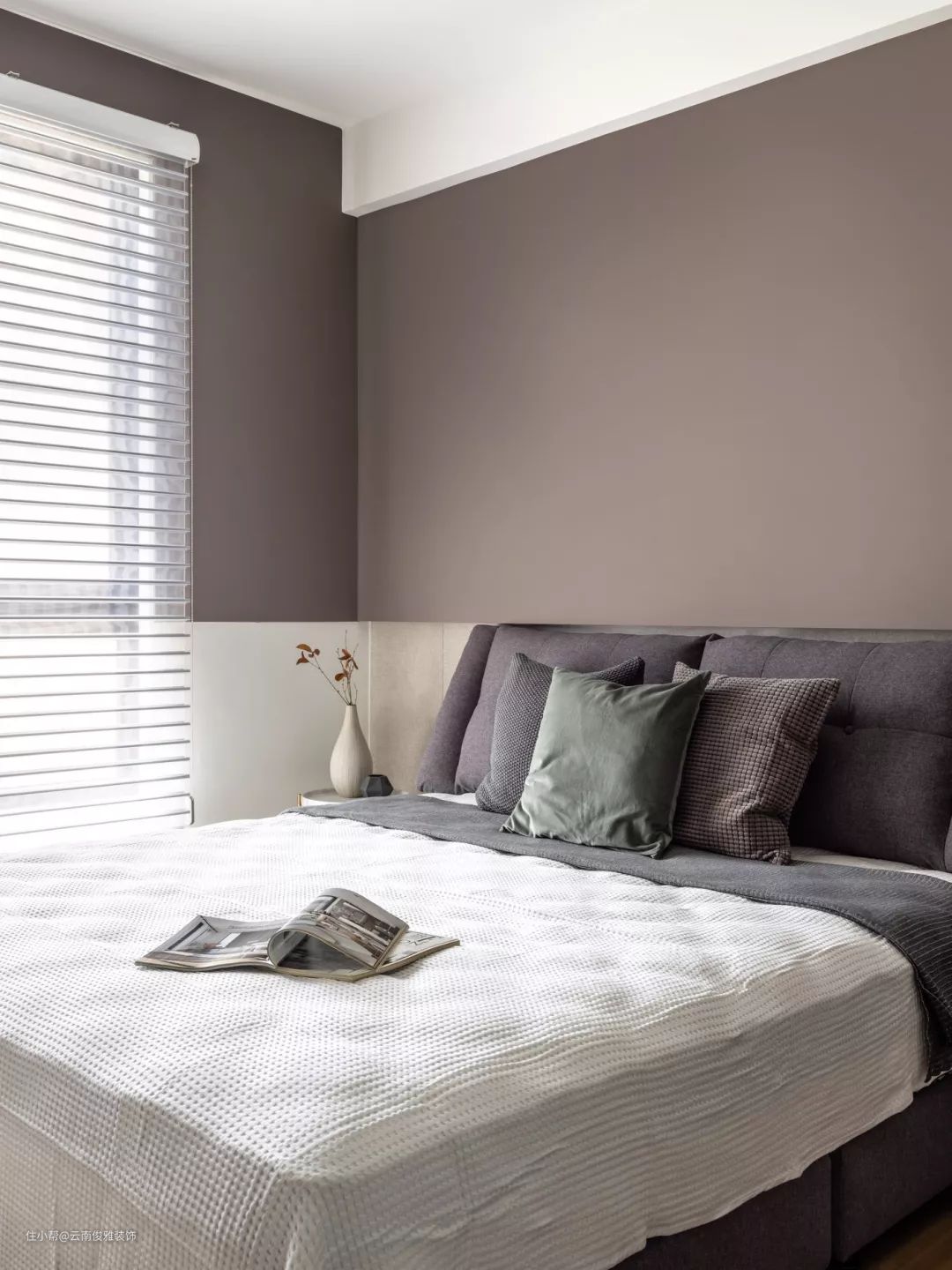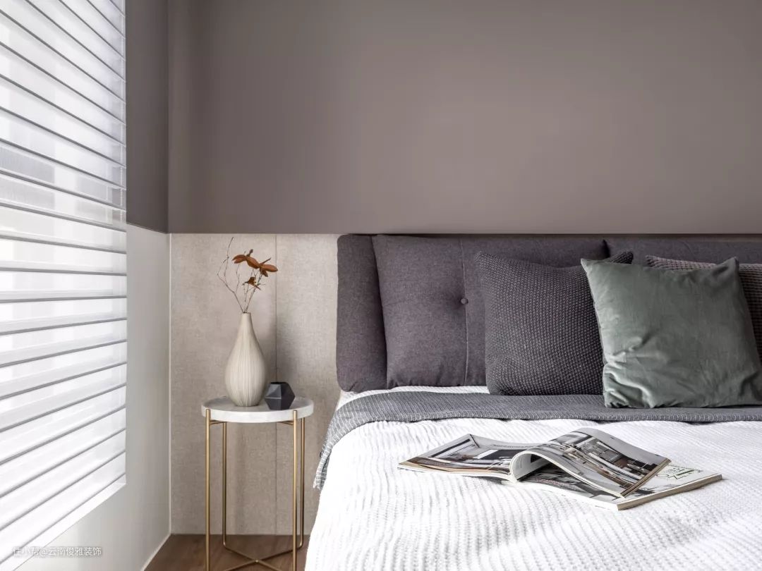 床头墙以软包面墙脚+水泥灰色的墙漆设计,搭配上灰色布艺的床头靠背,灰白床单布置,也让空间显得更加简约自然。