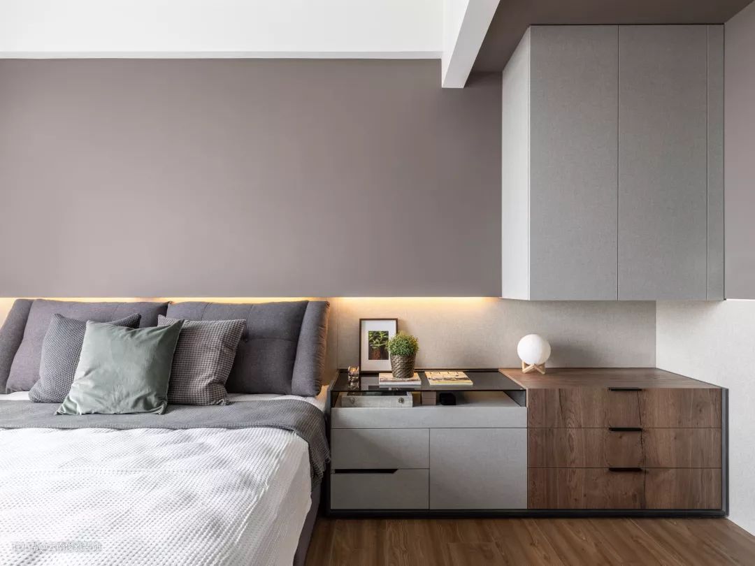 床头背景墙上方还留出灯槽来暗藏灯带,也让空间显得更加轻松惬意。对称的设计美学,稳定空间比例,显现出毫无违和感的舒适与细腻。