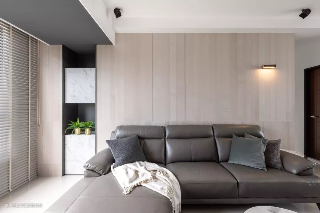 灰色皮质转角沙发,简单舒适,搭配上灰色的地毯,与整个空间契合。极简个性的沙发与茶几布置,让空间保持了一种简洁宽松的气息感。