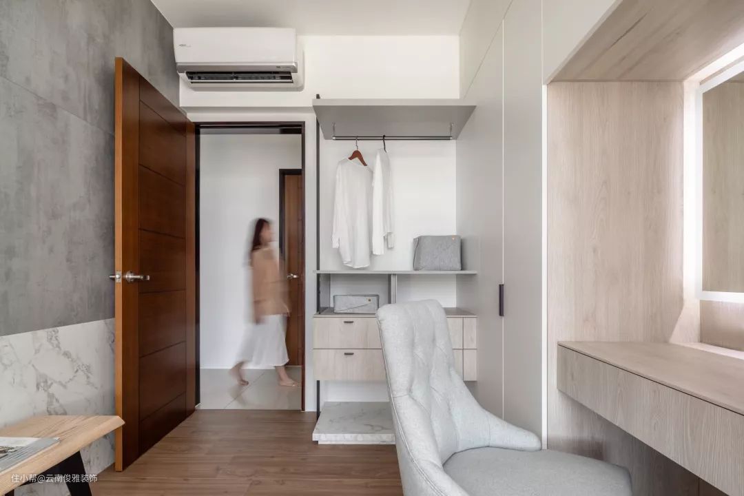 空出一间房间做衣帽间,白色通顶衣柜,中间掏空做成台面,加上一面镜子,妥妥的一个小型的梳妆台。