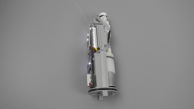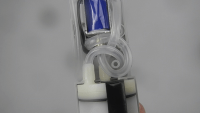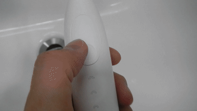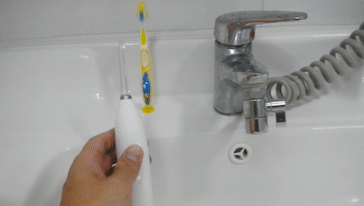 ▲由于采用了新标准的高压气泵气阀组件,空气高速压缩后能在0.14秒瞬间释放,而高速气流将动力储水槽中水流带出,经混合后喷射,以不小于100gf的冲力(①档力度)冲刷目标,图中的牙刷能明显看到它受到的冲击力。