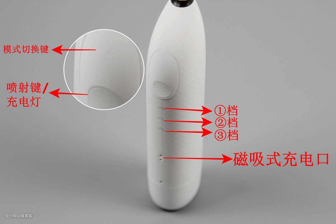 ▲冲牙器可以通过蓝牙连接手机,通过APP可以选择9档力度调节+2种牙龈按摩方案。在机器本体上已经有丰富的功能选择,如果不是非要看数据,那记住操控键就可以了。所有功能如图标识,冲牙器在加水开机后,前3-5次左右的喷射仅仅喷气体,后续则正常喷水。机身上选择1档时为手动档,需长按/连续点按喷射键,喷牙器持续喷射;2、3档为自动档,点按喷射键后,开始喷射持续25秒自动停止,喷射期间点按喷射键停止喷射,3档也是自定义档。