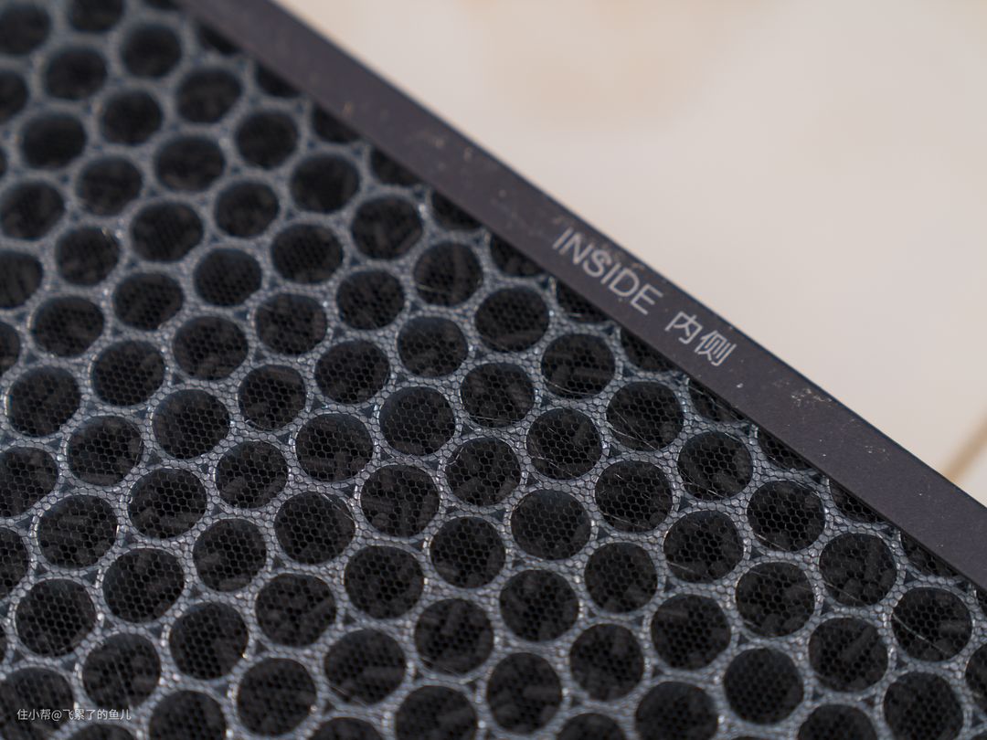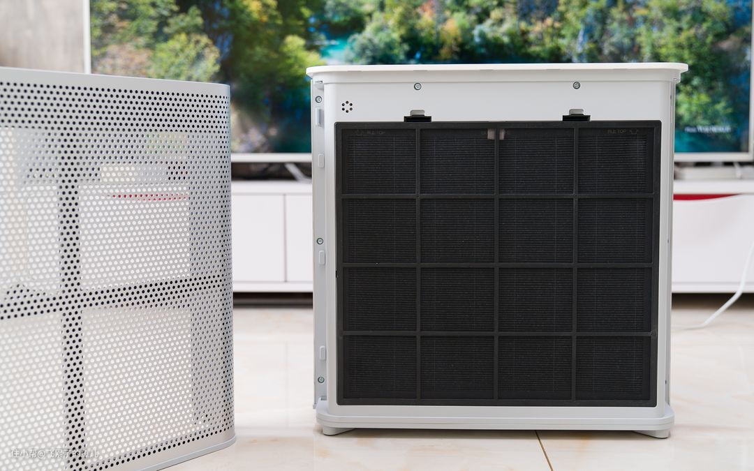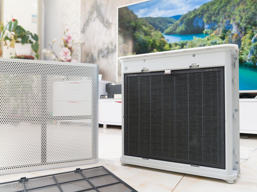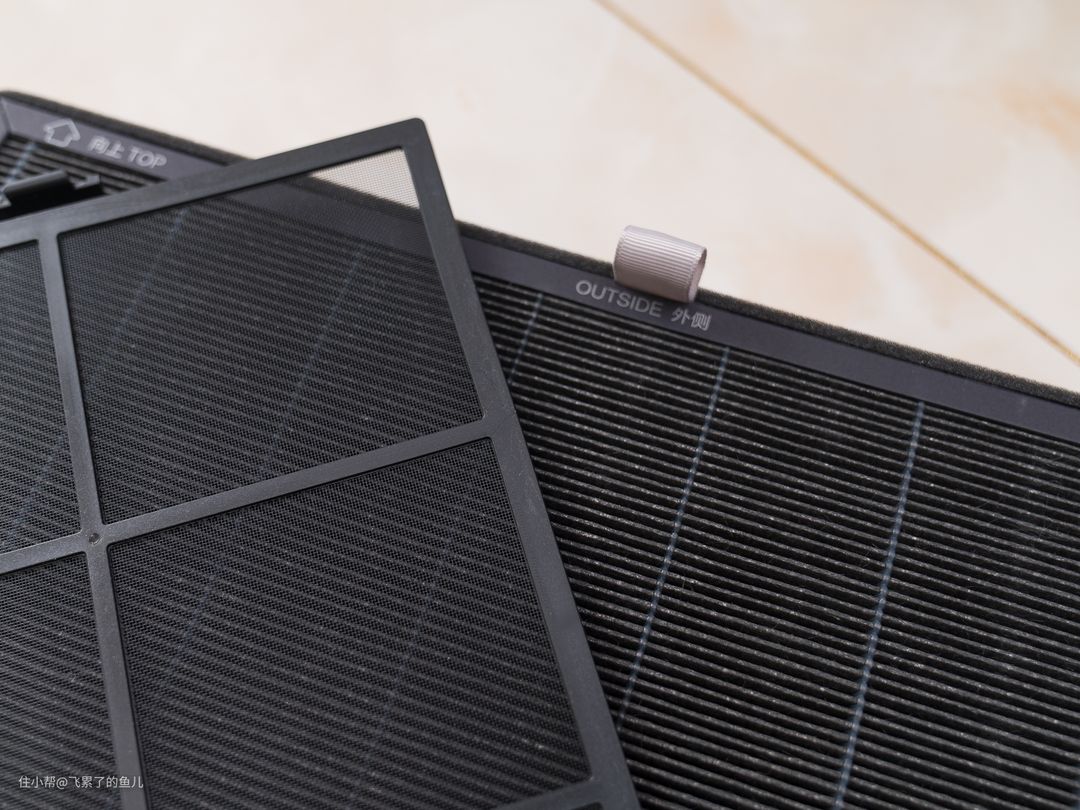 机舱盖板是以磁吸方式固定的,打开非常方便。取下盖板后,可以看到机身背部与进风口分布一致的C型滤芯。两端各一的拉带让我们可以轻松拉出滤芯。