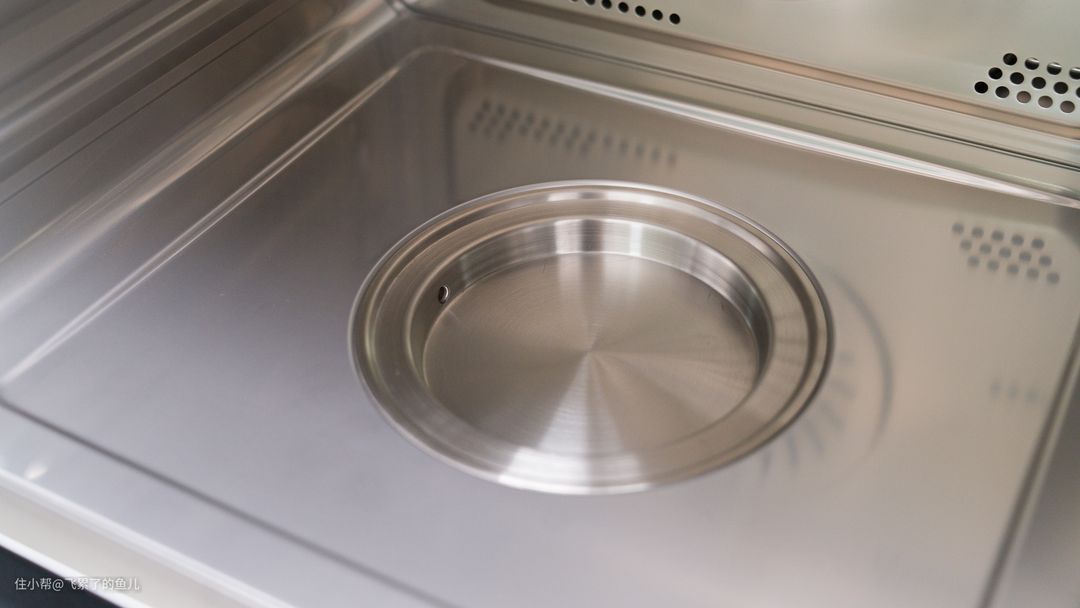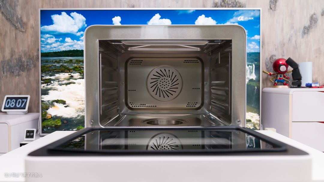 腔体底部,是一个大尺寸的圆形蒸发盘。水泵从水箱吸水后,蒸发盘可以快速蒸发产生高温水蒸气,效率上比我们用传统蒸锅要高效许多,免去了烧开一锅水的过程。米家智能蒸烤箱,将烤箱和蒸箱合二为一的设计,一方面可以淘汰家里的大蒸锅,节省空间;另一方面,相比较蒸锅,在蒸煮过程中,产生的蒸汽大幅减少,有效避免了把厨房整成“蒸笼”的情况,这么看,蒸烤一体还是相当实用的。