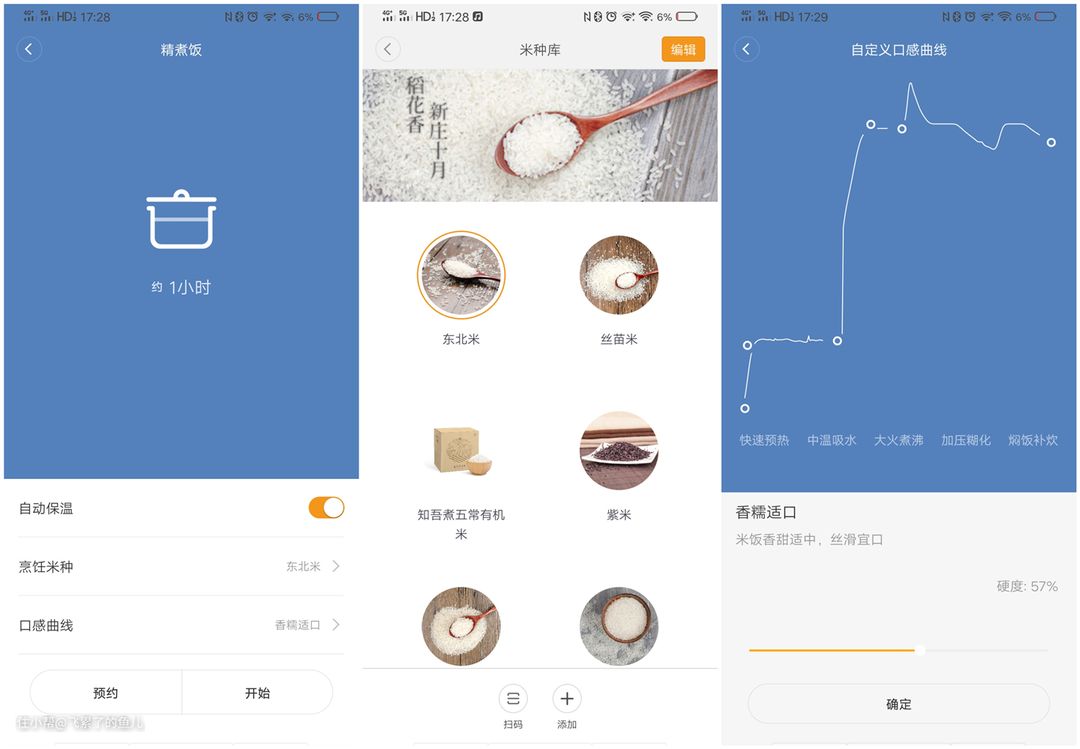 具体到煮饭方面,APP端可以细致的选择米种及口感曲线,米种库包括了东北米、丝苗米、泰国香米、珍珠米等11个品种,可以说是相当丰富了,号称米饭爱好者的我很多都没吃过,忽然间有点羞愧。有了它,作为米饭爱好者的我以后可以尝试更多的米种了。而口感方面,可以以1%的精度来定制米饭的软硬口感,对米饭口感有极致追求的用户可以多多尝试下。
