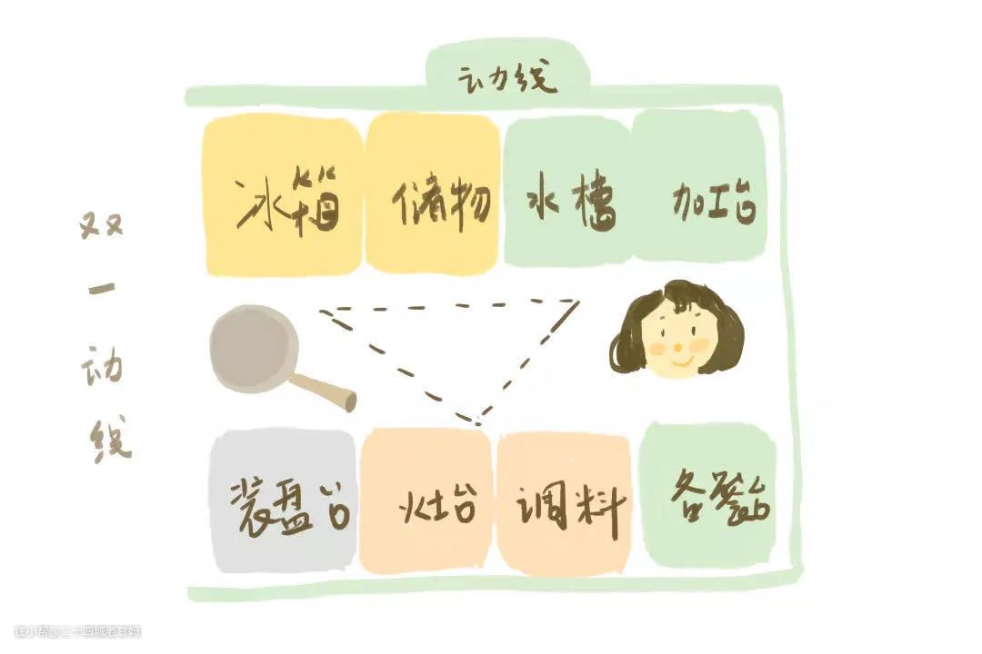 比如做一餐晚饭,要从冰箱里拿出食材—洗菜—切菜—放进盘子里备用—开火炒菜—放调料—出锅—装盘,这就涉及到四个区域:储物区、洗涤区、备餐区、烹饪区。