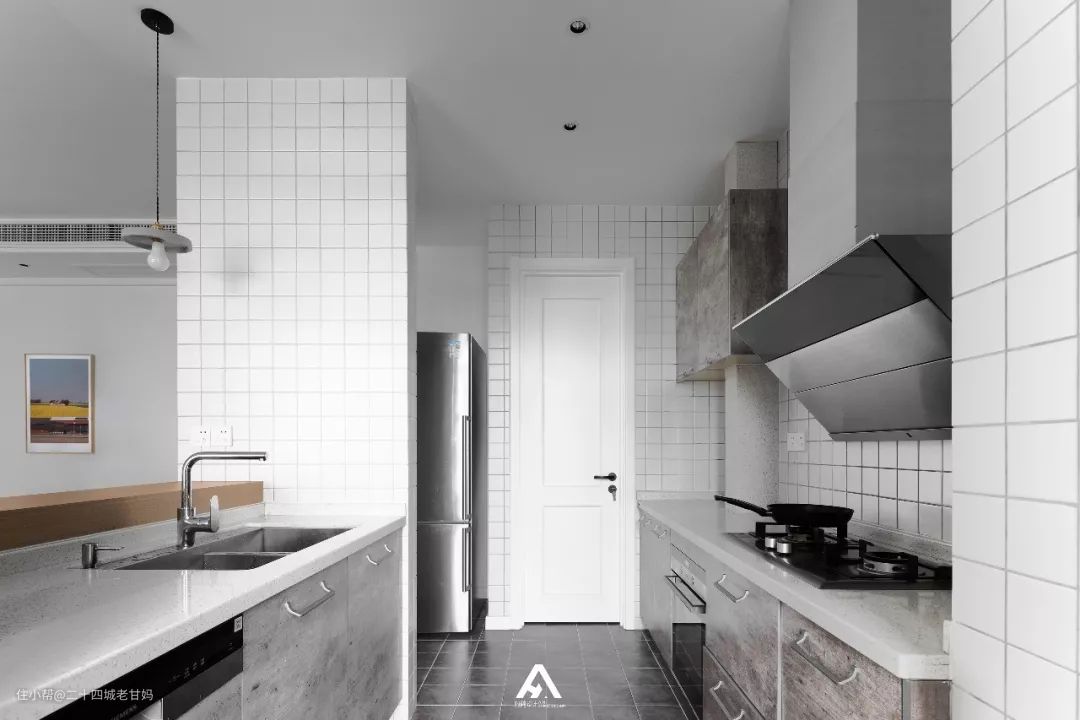 一字型厨房的动线比较长,做菜顺序一字排开:储藏空间(冰箱)——处理空间(洗菜)——加工空间(切菜)——烹饪空间(灶台),这样的布局才能最大程度上减少走动,让做饭变得流程清晰、区域分明。