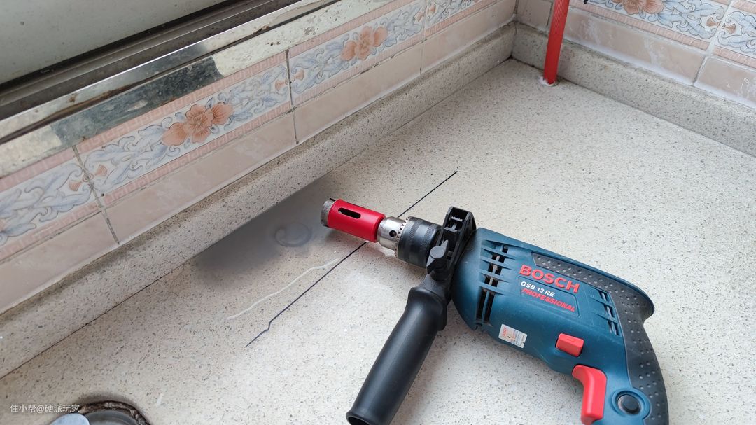 排水管如果要穿过橱柜台面需要购买两种规格的开孔器,因为排水管、进水管的水管尺寸不一样。如果可以接受,排水管尽量走橱柜面。