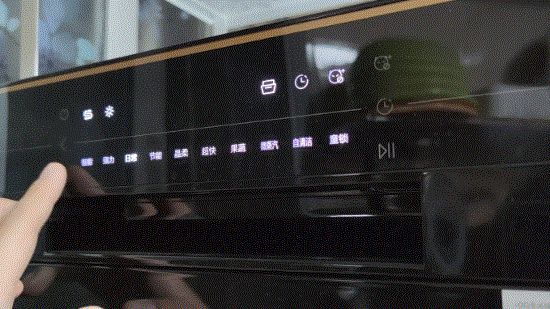 机器的上部是操作区域,操作界面十分简洁,通电之后,会显示洗涤程序。洗碗机采用内嵌把手设计,很轻易地就能开门,一开始我还以为机器有问题,后来才知道是厂家特意设计成这样,便于开启舱门。