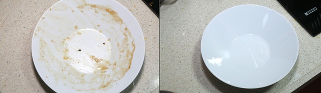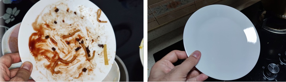 从碟子取样,将两个碟子“污染”了。右手边的碟子放洗碗机,而左手边的则手洗。