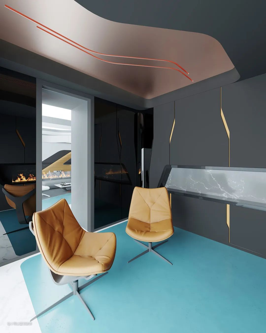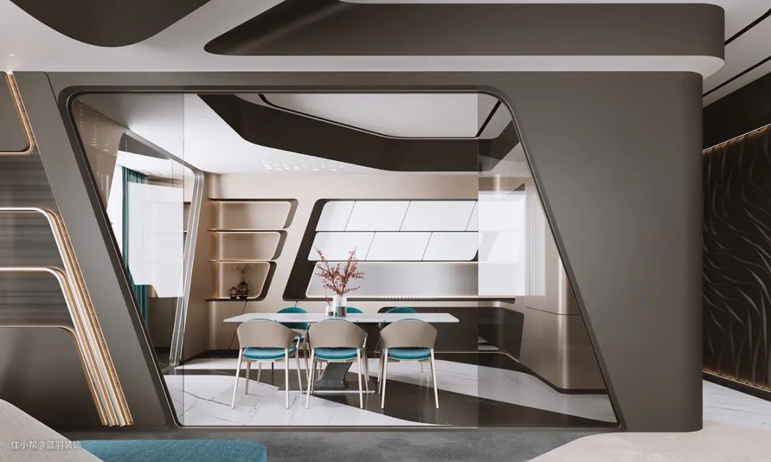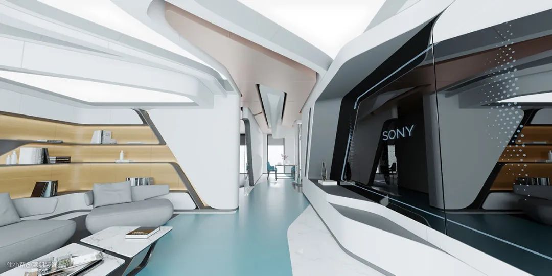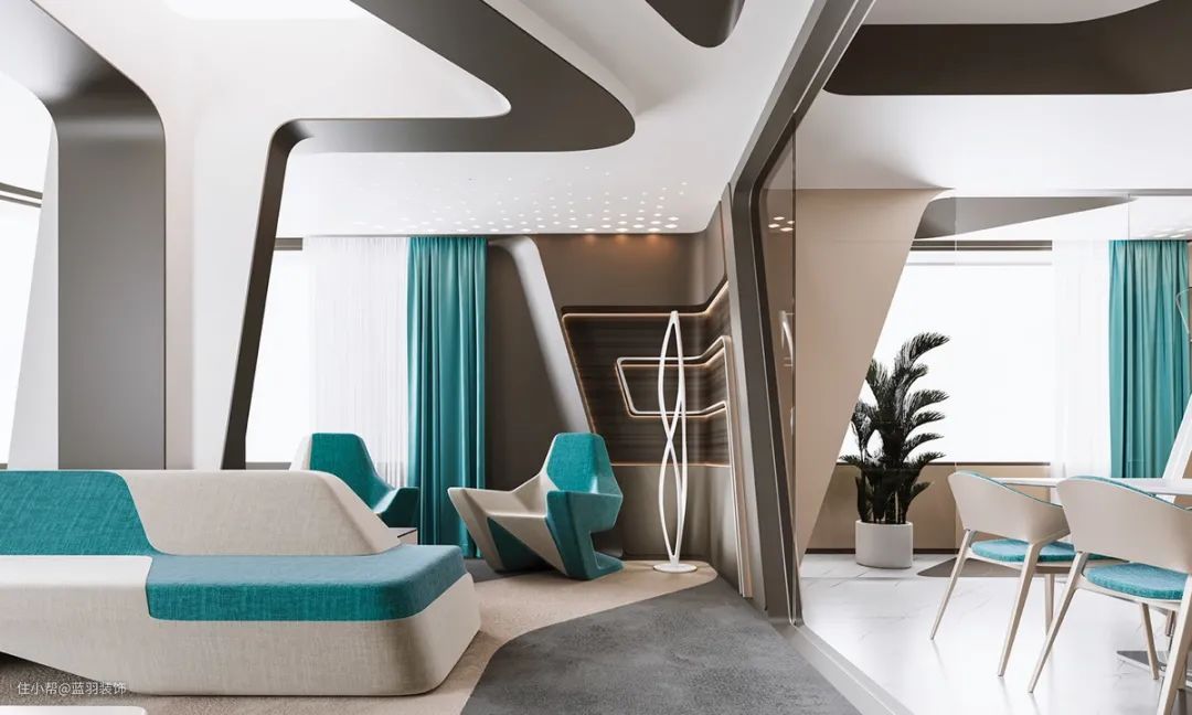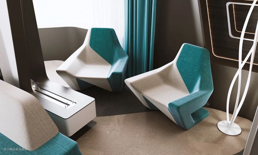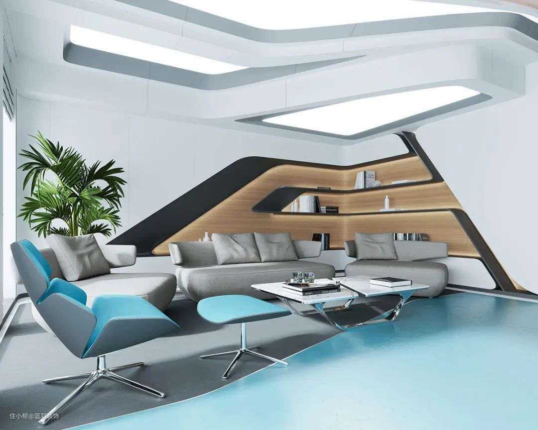 我们的第二个未来主义家居内饰采用大胆的青绿色色调,将独特的沙发设计分割开来。