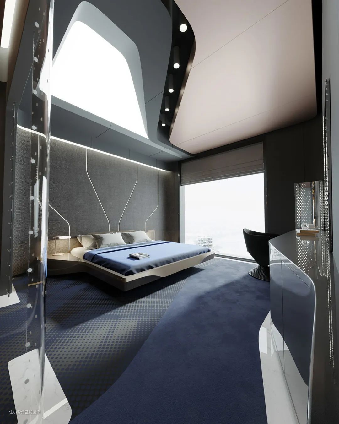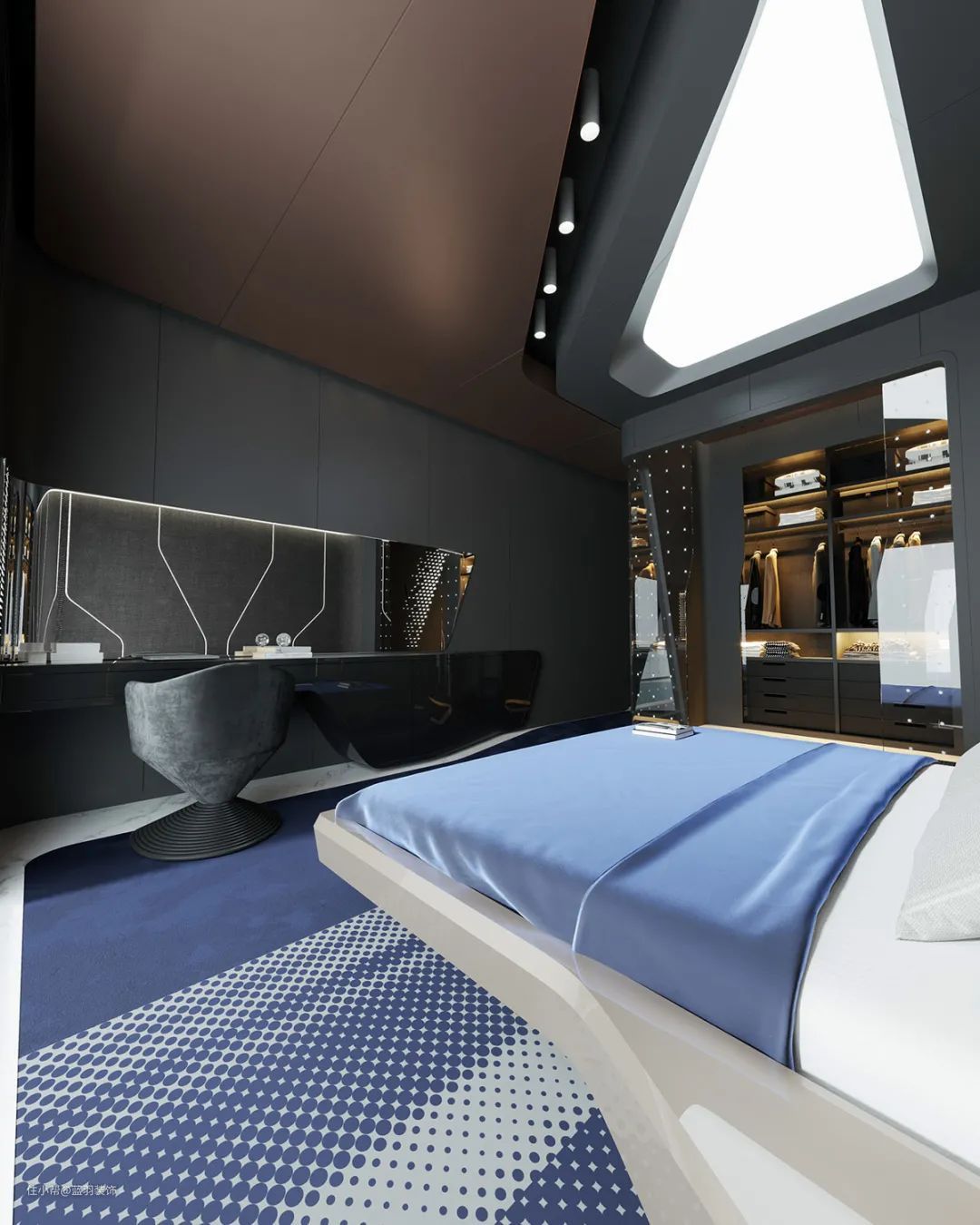 现代卧室有一种科技美学。床头板墙上有照明的轨道,就像一块巨大的电路板。