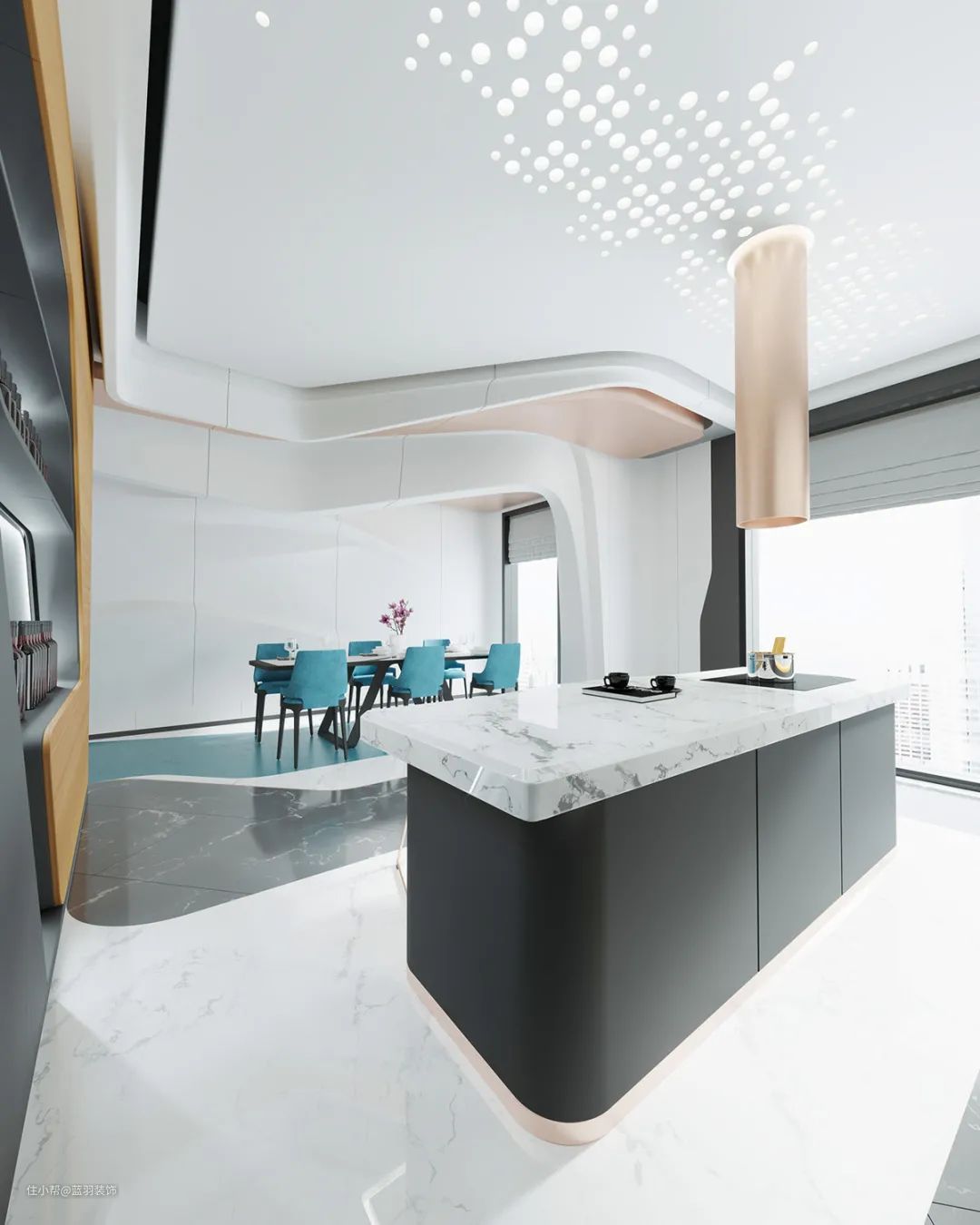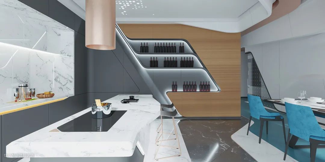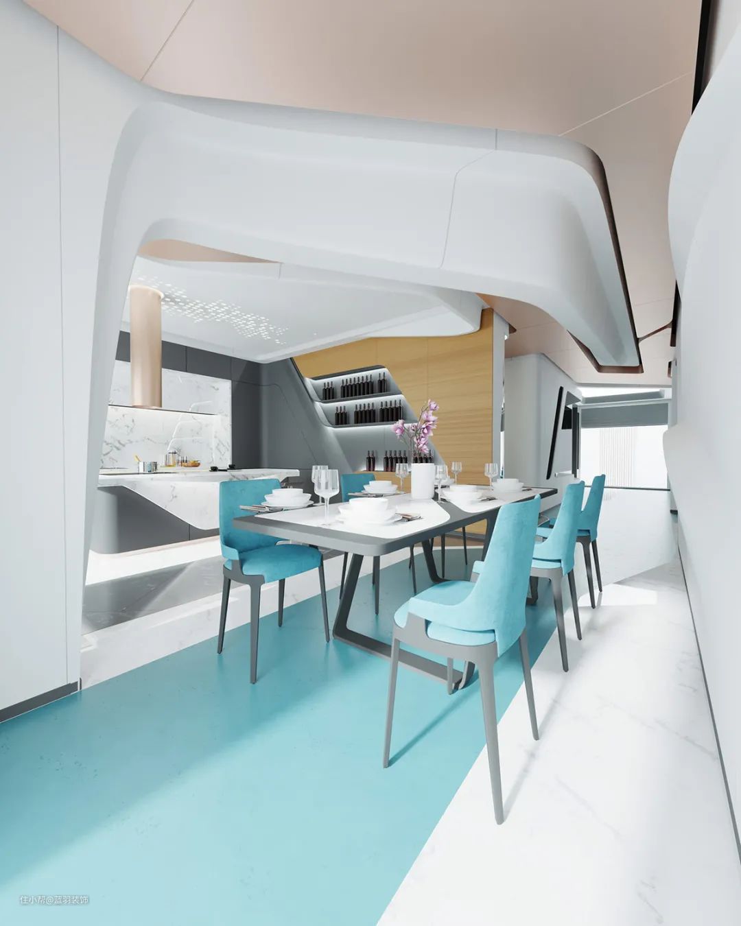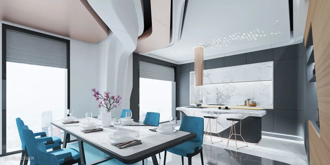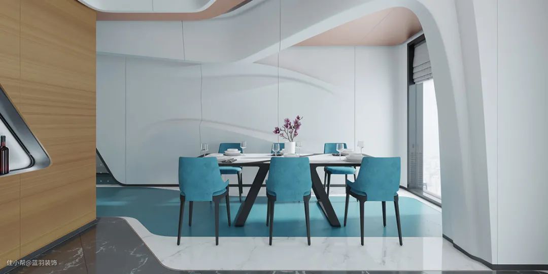 蓝色层压板像一条鲜活的河流流过现代餐厅的地板。