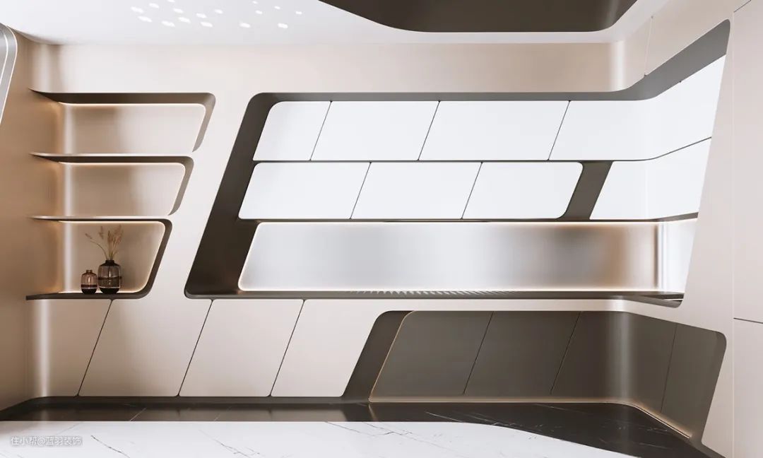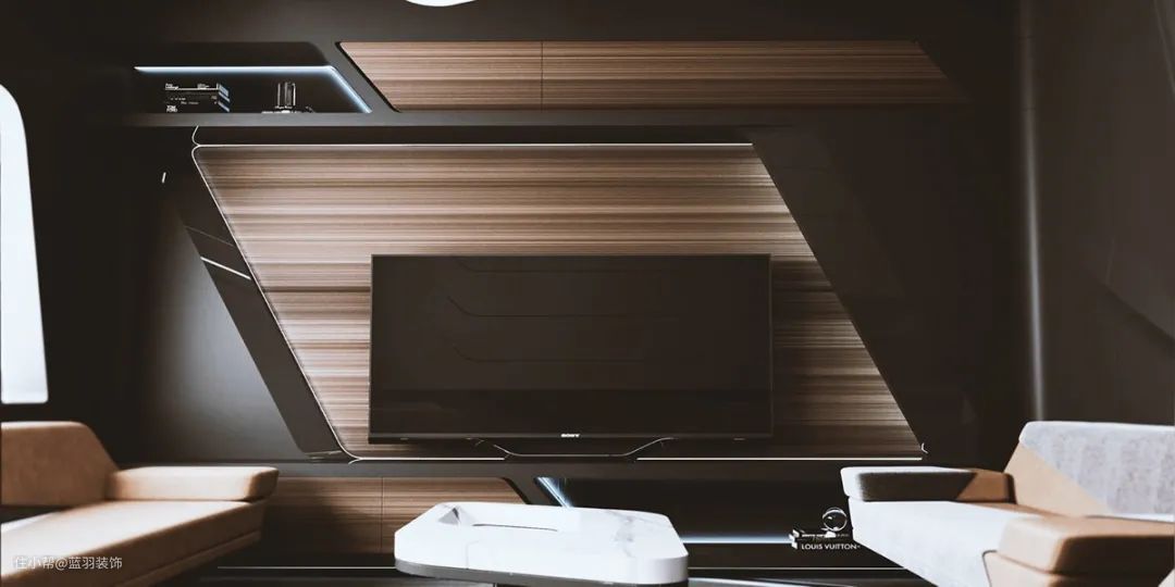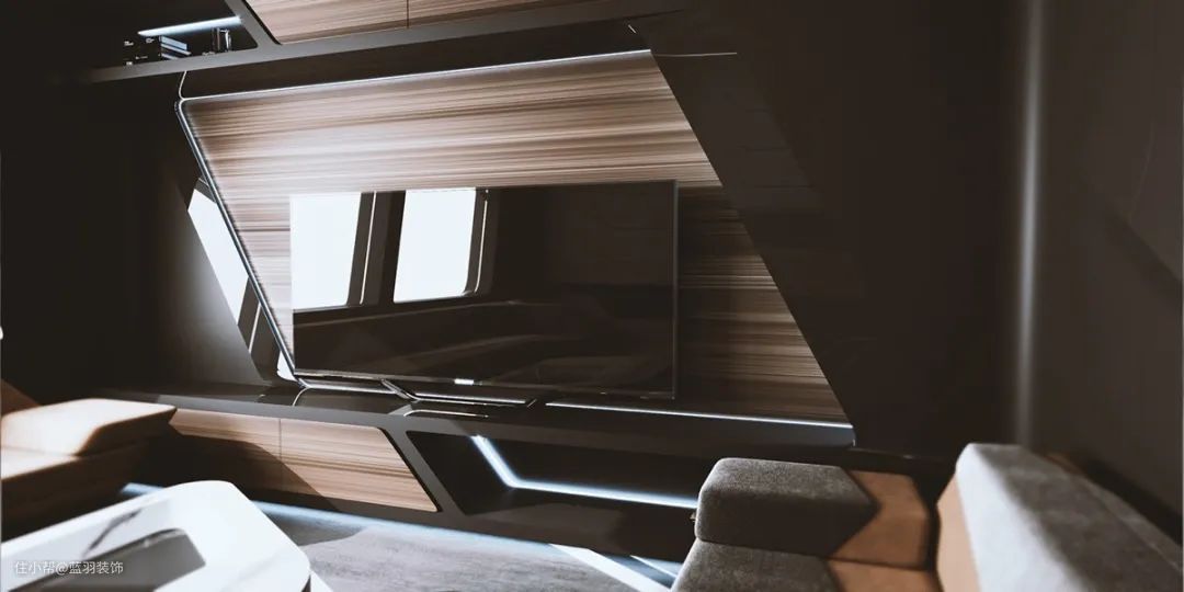 电视墙的制作就像太空船的控制室,有一个独特的切割屏幕安装和集成媒体单元。