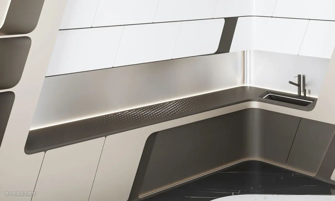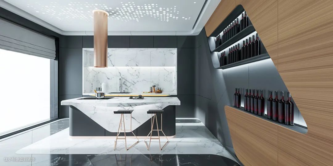 就连L形厨房的橱柜都是斜切的,就好像整个房子都在以翘曲的速度飞过空间。