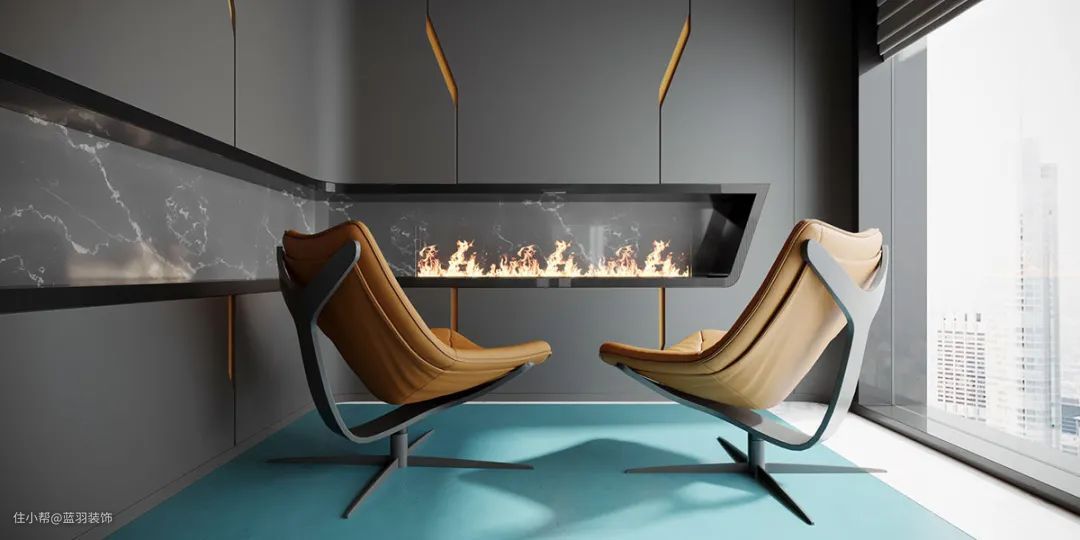 一对旋转椅坐在熊熊燃烧的火焰旁,用温暖的白兰地颜色装饰,以补充方案中的铜元素。