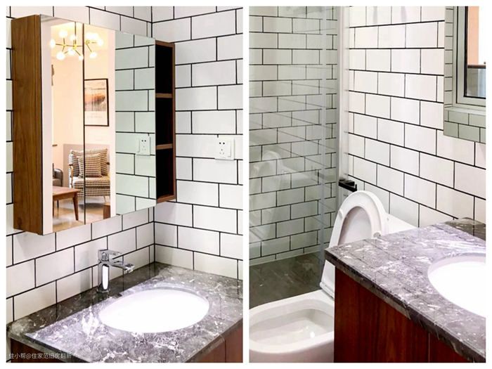 现代洗手间则是采用了北欧的经典马赛克小格纹瓷砖,小格子的瓷砖让狭小的卫生间变得整齐明亮,瓷砖材质能够有效防水且容易清洁。干湿分离也很到位,马桶靠近淋浴间一侧,方便使用冲淋设备清洁马桶,而且也不会弄湿地板。
