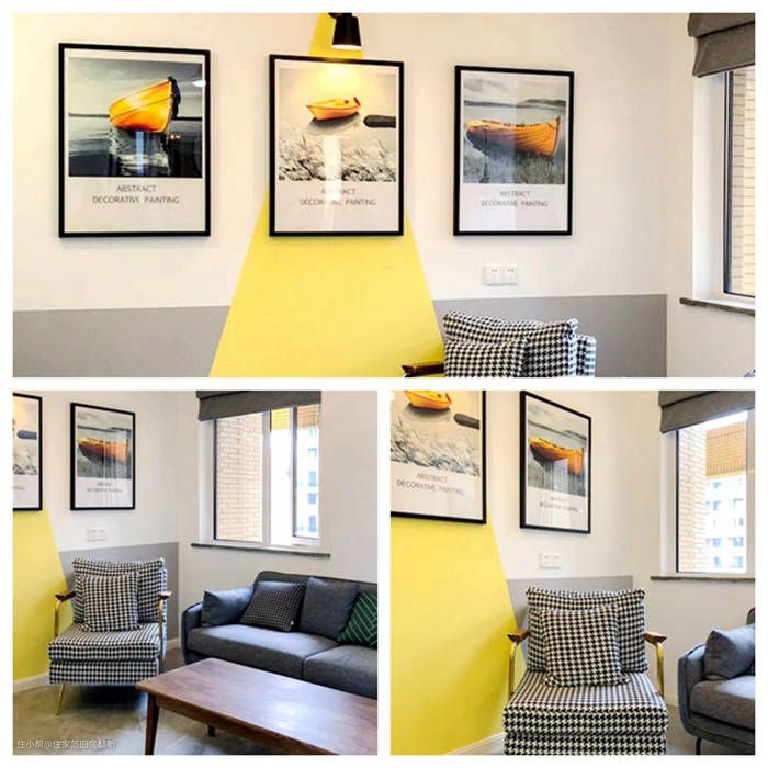 进门后的正对墙面使用灰色和黄色的几何色块装饰,因为客厅的空间不大,所以在设计时更需要谨慎,既要充分利用整个空间,更要在视觉上将空间扩大。整个客厅风格为北欧风,黄色的三角形色块搭配黄色壁灯,能有效增加空间的扩张力。