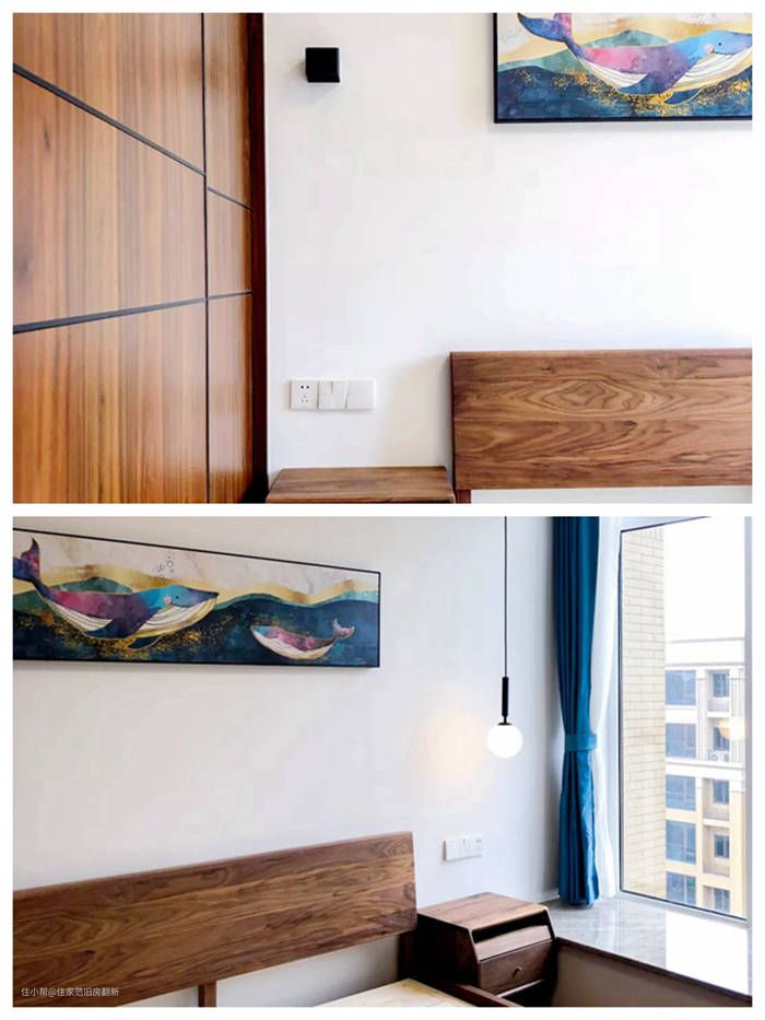 鲸鱼挂画和简约的床头吊灯又将空间格调拉回了北欧风中,现代感加上舒适感,这才是卧室该有的风格!