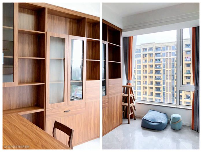 客厅的后面是一个简单的开放式书房,书房是由一张实木书桌和一面嵌入式实木书柜组合而成。因为背靠巨大的落地窗,所以采光效果极好,在这里看书和学习,心情会变好哟!