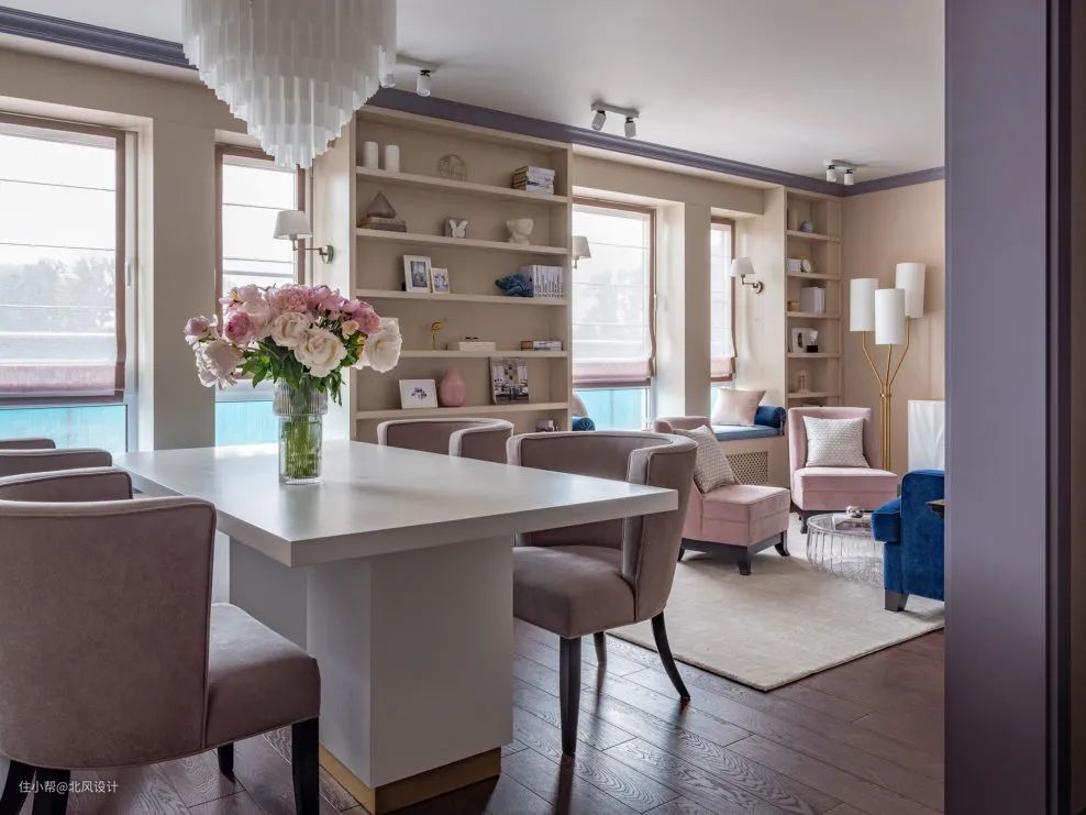 在小空间中,可以选择落地帘和罗马帘的混搭,赋予空间形式的多边性和图案的统一性,尤其是在单一白色背景下,一款色彩丰富的组合窗帘能大大提升空间气质。