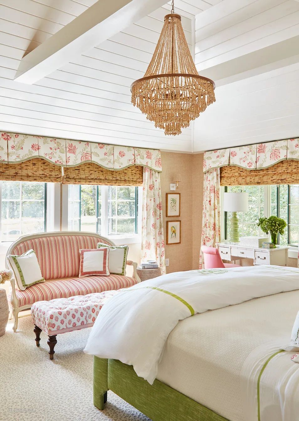 用同一款布料去装饰窗帘和房间的其他地方,巧妙地呼应产生定制的感觉。如果你对材料和形状特别痴迷,可以试试这种双层造型窗帘,它既甜美又田园,为丰富的房间创造完美的收笔。