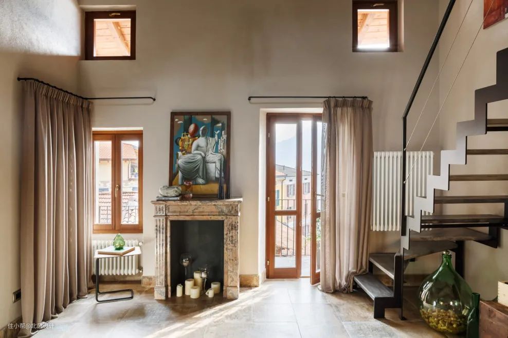 还记得这种顶部打结式的窗帘设计吗?它们轻松随意的造型往往能唤起波西米亚的悠闲氛围。这间高大的卧室铺展在浅灰的幕布下,拾级而上的圆顶造型使它看上去像教堂一般壮丽,拼色窗帘伸展开柔软的触角,使房间变得蓬松、柔软、丰富多姿,搭配鹿角造型床和优雅的法式家居,显得精致而体贴。