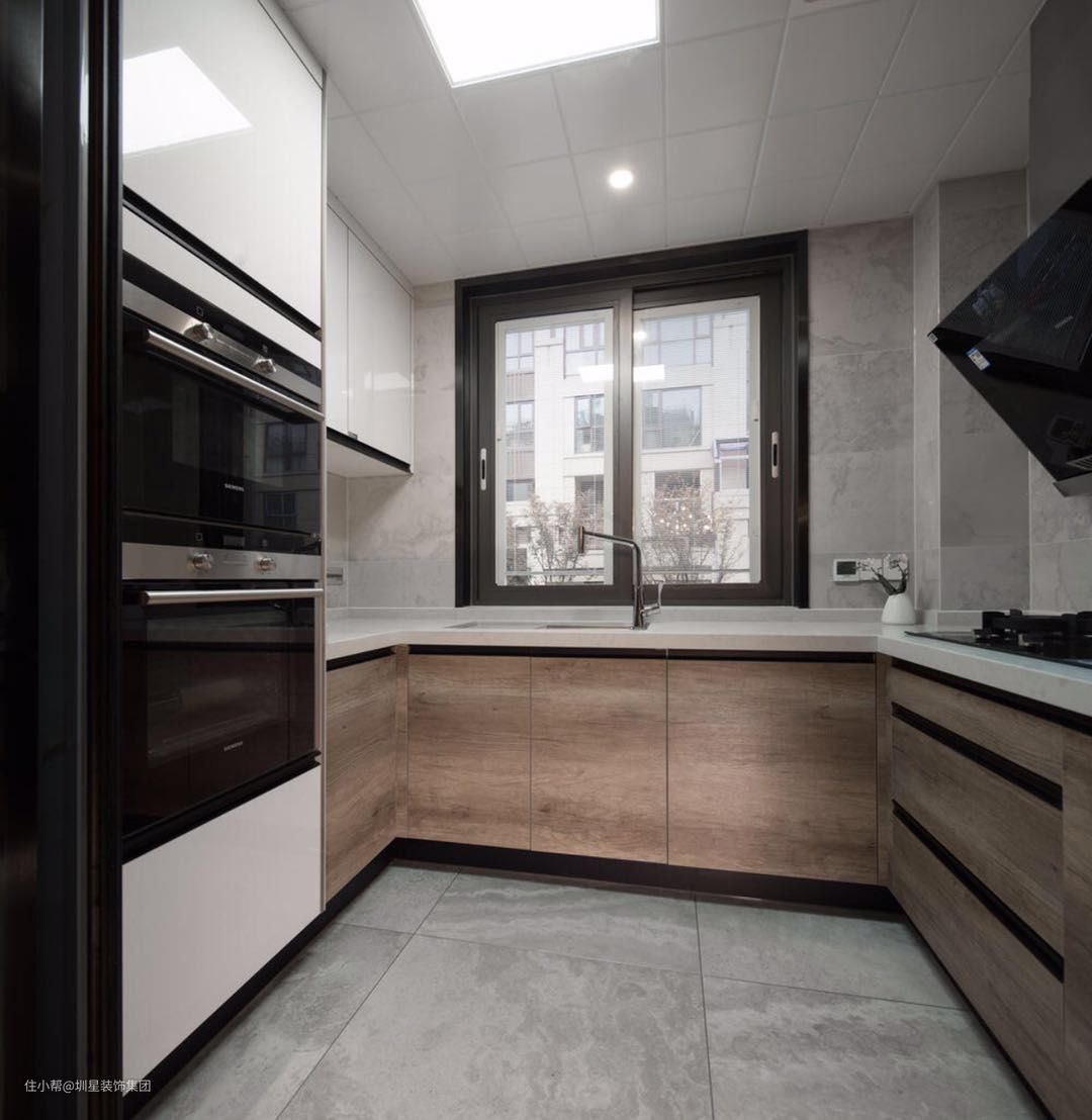 8.厨房功能为主,配色为做旧木色、米灰色瓷砖,光面黑,简洁温馨。
