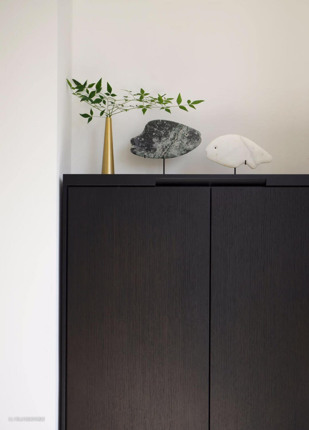 7.餐厅左侧是从地下车库进来的入户门,为了维持整个空间的简洁,入户门做成了隐形门。餐边柜上的插花植物就是院子里折来的,经济、方便四时常有,却非常