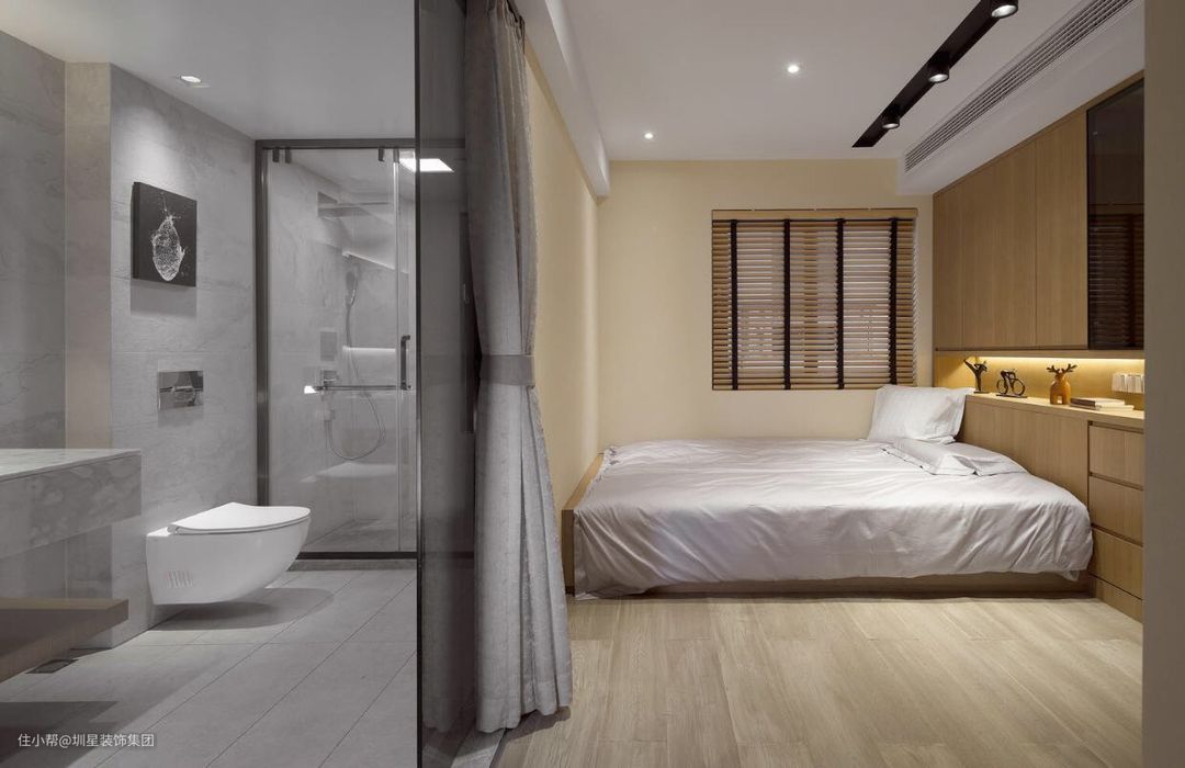 15.儿子房间因为面积不大,所以我将卫生间与卧室打通,用半扇玻璃隔断和灰纱帘作虚隔断,令两个空间视野大增、人机尺寸也非常富裕,半虚半实之间得一夜美