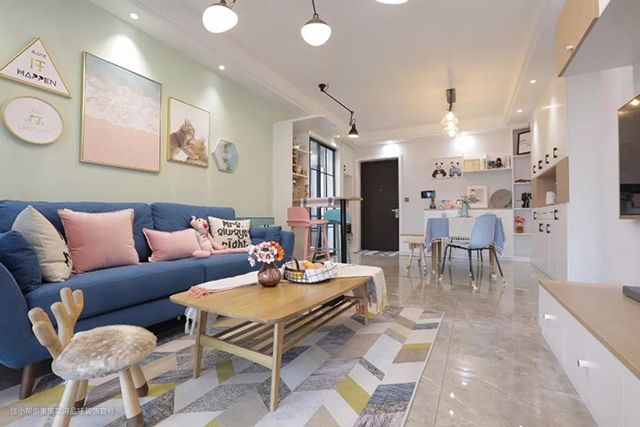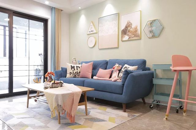 蓝色布艺沙发,粉色抱枕点缀,薄荷绿色背景墙纸,这些温馨纯粹的色彩能让整个空间都软化,营造小清新的居家氛围。阳台作为猫舍,女主人爱猫,养了好几只猫咪,家里很多小细节都得以体现。