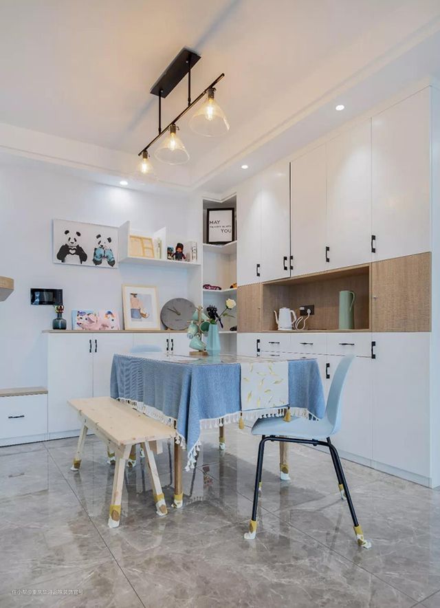 马卡龙色系桌布和餐椅,搭配原木色和米黄色系储物柜,实用的同时也能带来赏心悦目的欢喜。