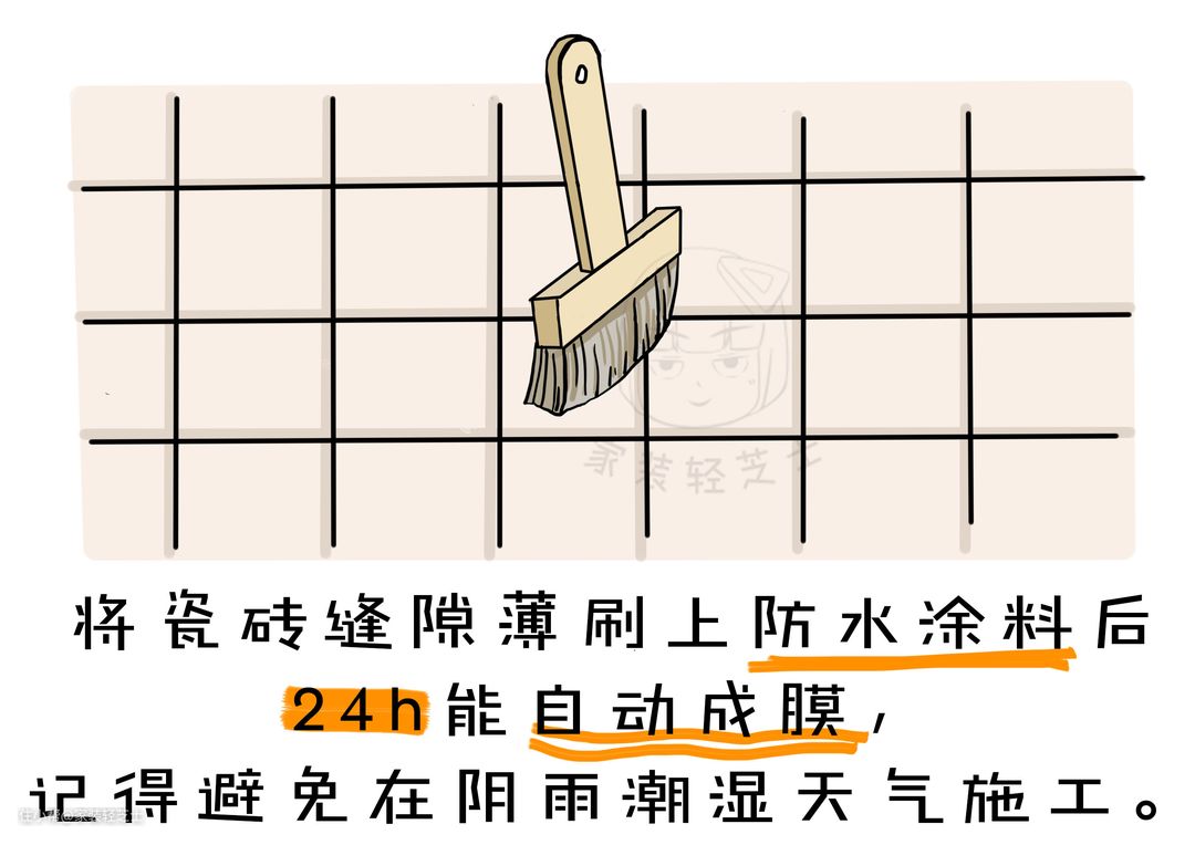 在瓷砖缝隙薄刷防水涂料后24h能自动成膜,在施工时,要记得避开在阴雨潮湿天气。