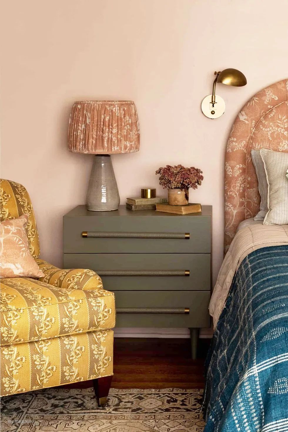 在这间折衷主义的卧室中,混合了柔和的黄色,绿色和粉红色,层次感分明。蓝色的床罩可确保配色方案看起来不会太过公式化,而暗粉色的布艺和奶油粉色底色则可与黄色扶手椅相得益彰。