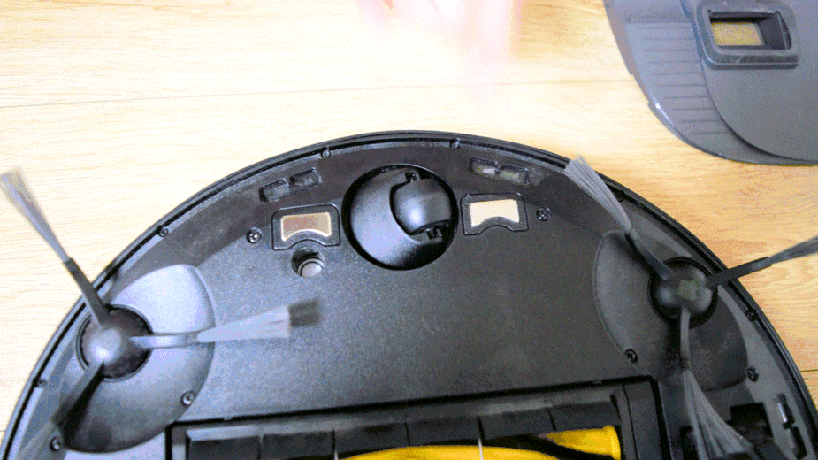 打开上翻盖后可以看到与大部分扫地机器人一样的机内布局,中间最醒目的是集尘盒,下方则收纳了已经成为目前扫地机器人标配的清洁毛刷。