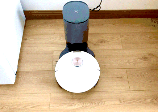 完成清扫后,机器人就自动回到集成底座充电了,由于需要爬一个小坡,需要尽量保证稳定,因此速度也会比较缓慢,扫地机器人站稳后,集成底座就开始收集尘盒中的垃圾灰尘了,为了不造成扬尘和二次污染,整个过程是在密闭环境下进行,因此噪音也很大,这可能是使用了这几天下来最大的一处槽点了。