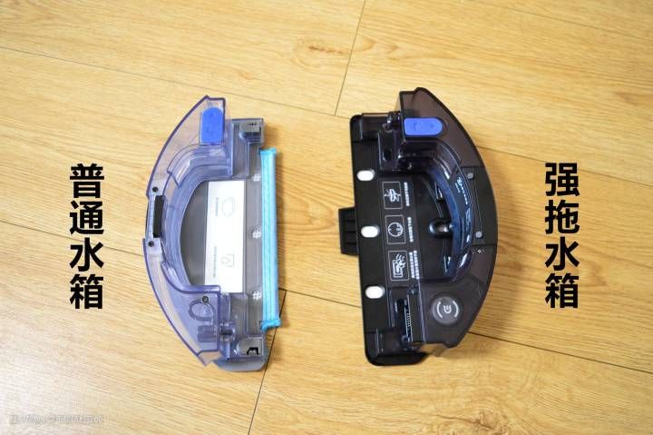 而另一个强拖水箱主要是针对地上的顽固污渍,这个水箱由于内置了电机,拖布能实现480/分钟往复高频振动,并可以进行三档水量调节,专门用于清理地上的顽固污渍,比如清理已经干掉的番茄酱、酱油,能够实现更好的清洁效果。
