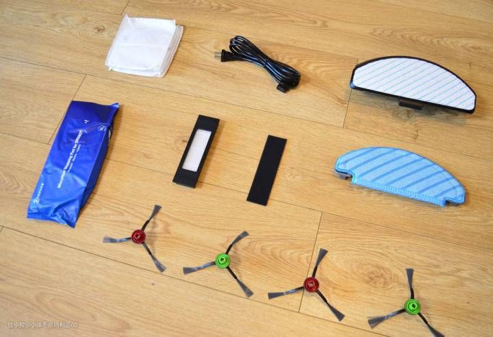 除了主机和集成底座,此次超能王附带的配件真不少,一件一件拿出来感觉摆了好久,除了两个拖地水箱之外,还附带了一个可更换集尘袋,一包一次性拖布,四个替换刷头,以及HEPA过滤棉,从配件数量上来看还是相当有诚意。