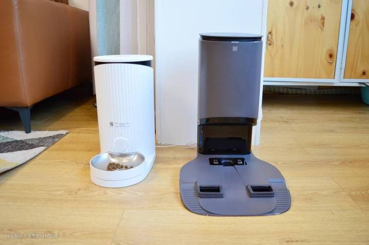 看完了机器主体再来看看自动集尘底座吧,这个底座集合了充电桩和自动集尘的功能能,外观跟新一的自动喂食器放在一起是不是有几分相似之处,为了使底座上的吸尘口与机器更好的进行结合,增加密合性,底座被设计成了斜坡面,通过底部动力滚轮内置的弹簧,使两个接口达到紧密的结合。