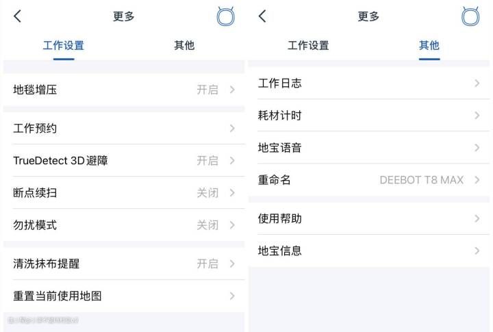 根据清扫环境的不同,在App中还可以对吸力和拖地的出水量进行设置,日常使用时标准吸力和中度出水量就可以完全应付了。