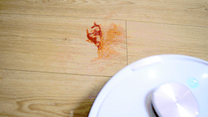 之后为了加大难度,小泽又尝试用超能王清理放置了6个小时以上的番茄酱,可以看到番茄酱已经微微有些凝固了,但扫地机器人还是一边带过,清洁效果确实不错。