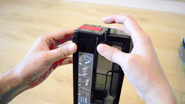 通过拉动集尘盒顶部的把手就可以将集尘盒提出,把手侧面设计了一个小卡扣,在安置时需要先将卡扣对准机身上的卡槽,这样把手才能够顺利按压下去。