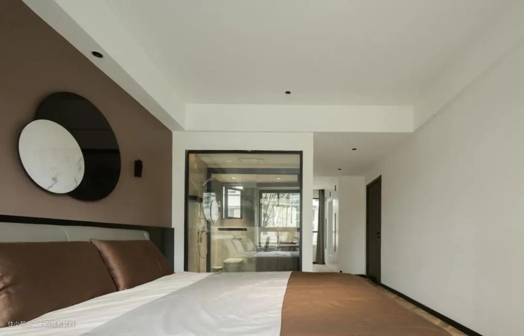 ▲卧室沿袭主色调,咖色床头背景墙,挂上黑白圆盘装饰,营造极简轻松舒适的休憩空间。窗边放置女主人最爱的梳妆台,便利又实用。